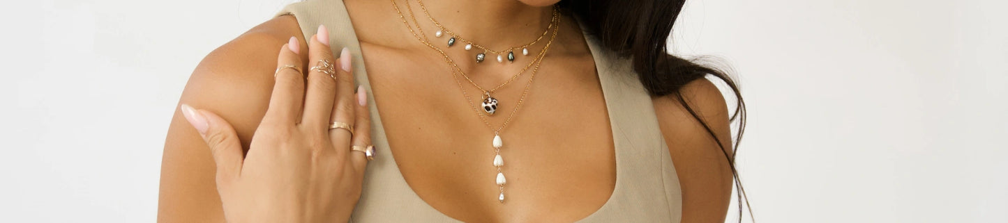 All chains and findings are 14k gold-filled. Gold fill is created by pressure bonding a layer of gold to another metal. Pieces are tarnish resistant, long-lasting, and sensitive-skin friendly. Gold-filled material typically has a life span of 10 to 30 years when taken care of properly.